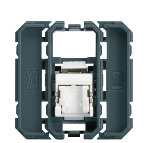 Cette prise rj45 catégorie 6 Hager Gallery est à habiller d'un enjoliveur et d'une plaque de la même gamme.