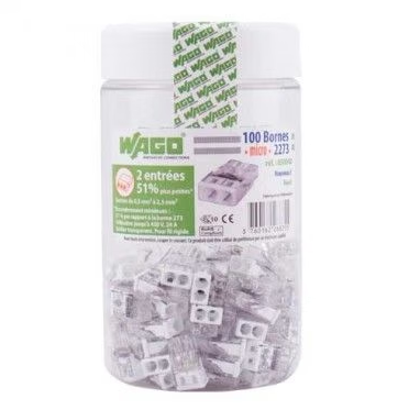 Bornes de connexion rapide WAGO S2273 : solution compacte et fiable pour vos installations électriques. Cette boîte de 100 mini bornes 5 entrées ac...