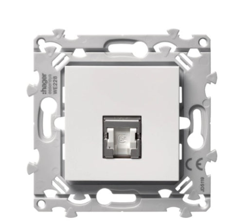 Matériel électrique Hager de la gamme Essensya livré avec enjoliveur blanc. Prise électrique de communication pour réseau internet.